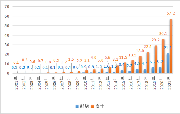 截至2021年底,全球海上風(fēng)電累計裝機容量為57.2吉瓦,同比增長近60%,其中中國占48%,英國占22%,德國占13%。從新增裝機容量看,2021年呈爆發(fā)式增長,全球海上風(fēng)電新增裝機容量21.1吉瓦,占全球新增總裝機容量的比重為22.5%;2021年新增海上風(fēng)電裝機中中國占80%,英國占11%,越南占4%。(見圖1)