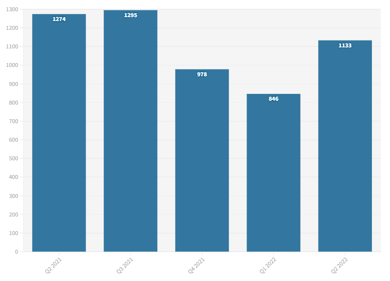 特斯拉公司在2022年第二季度部署了1,133MWh電池儲能系統(tǒng),而2021年第二季度為1,274MWh,2021年第三季度為1,295MWh。然而,與2021年第四季度(978MWh)和2022年第一季度(846MWh)相比,這一數(shù)字有所增加。