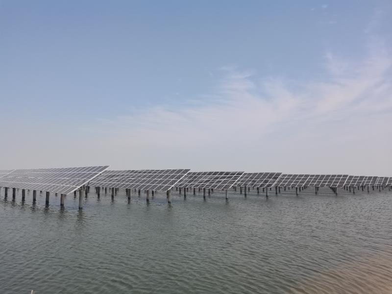 電站建設區(qū)域為坑塘水面,采用漁光互補運營模式,光伏場區(qū)劃分為11個發(fā)電單元,由11組3.15MW光伏陣列組成,采用PHC預制管樁、固定支架,共安裝單晶雙玻高效455Wp太陽能電池組件44200塊、450Wp太陽能電池組件44252塊。主要電氣設施設備選用技術(shù)先進、功能配套、運轉(zhuǎn)高效的逆變升壓一體機、儲能、無功補償、接地變、PT柜、35kV開關(guān)柜、廠用變及電氣二次設備、調(diào)度自動化裝置等,設2回35kv集電線路,1回35kV送出線路,通過9.8km架空線纜,接入臨海110kV變電站,實現(xiàn)與東營市電網(wǎng)并網(wǎng)。