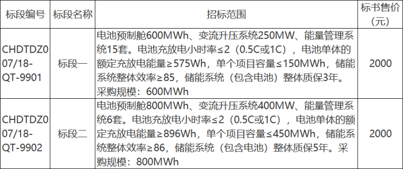 標(biāo)段二采購規(guī)模:800MWh,電池預(yù)制艙800MWh、變流升壓系統(tǒng)400MW、能量管理系統(tǒng)6套。電池充放電小時(shí)率≤2(0.5C或1C),電池單體的額定充放電能量≥896Wh,單個(gè)項(xiàng)目容量≤450MWh,儲(chǔ)能系統(tǒng)整體效率≥86,儲(chǔ)能系統(tǒng)(包含電池)整體質(zhì)保5年。