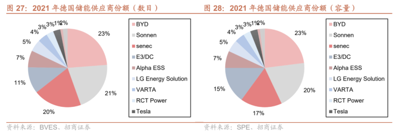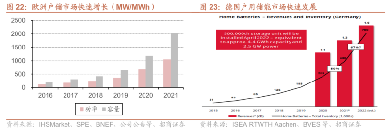 歐洲戶用光儲(chǔ)市場(chǎng)爆發(fā)。目前戶用光儲(chǔ)兼顧了投資業(yè)主(經(jīng)濟(jì)性、用能安全)和電網(wǎng)運(yùn)營(系統(tǒng)穩(wěn)定)的多方需求,歐洲戶儲(chǔ)市場(chǎng)進(jìn)入爆發(fā)期。2021年歐洲戶儲(chǔ)裝機(jī)1GW/2GWh,同比增長56%/72%,其中德國是最主要的戶儲(chǔ)市場(chǎng),占據(jù)歐洲70%以上的市場(chǎng)份額,2021年德國戶儲(chǔ)銷量約15萬臺(tái),同比增長45%,累計(jì)銷量43萬臺(tái),2022年4月末,戶儲(chǔ)安裝量進(jìn)一步增至50萬套上下(2.5GW/4.4GWh)。