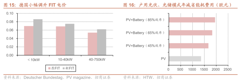 消費(fèi)電價(jià)上漲,戶儲(chǔ)經(jīng)濟(jì)性優(yōu)化。參考目前歐洲大部分地區(qū)電價(jià)水平及光伏、儲(chǔ)能系統(tǒng)報(bào)價(jià),戶用光儲(chǔ)LCOE已經(jīng)有明顯的成本優(yōu)勢(shì)。在市場(chǎng)機(jī)制允許的情況下,利用峰谷充放也有收益空間(部分分時(shí)電價(jià)地區(qū))。以德國為例,目前居民用電價(jià)格在30-40歐分,單戶年用電量在3000-5000kWh,電費(fèi)支出約1000-2000歐元。而對(duì)5kW+7kWh戶儲(chǔ)系統(tǒng),單套設(shè)備投資額大致為1-1.5萬歐,以1200-1300h發(fā)電小時(shí)數(shù)估算,年有效發(fā)電量在6000kWh以上,除了滿足自用外,余電可以FIT電價(jià)上網(wǎng)獲取部分收益。估算大部分情況下,5-7年可收回項(xiàng)目投資(實(shí)際回報(bào)期除電價(jià)、設(shè)備投資等因素外,戶用電量、晝夜電量分布等也有較大影響,且不同地區(qū)提供差異化補(bǔ)貼,大幅縮短回收期)。
