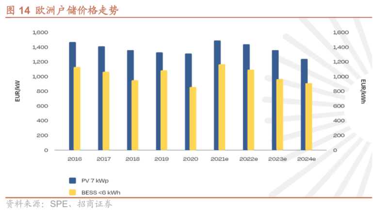 成本上,戶用光儲(chǔ)系統(tǒng)主要成本項(xiàng)目由光伏系統(tǒng)、儲(chǔ)能電池、變流設(shè)備構(gòu)成。2016-2020年間德國戶用系統(tǒng)成本下降24%,雖然在最近兩年由于供應(yīng)鏈擾動(dòng)造成了階段性的價(jià)格抬升,但預(yù)計(jì)未來整體仍將繼續(xù)下降。