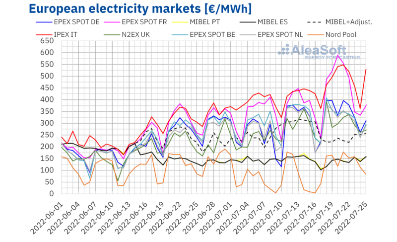 7月第三周,歐洲大部分電力市場的價格較前一周有所上漲。其中,意大利市場的電價遙遙領(lǐng)先,其日前市場電價均值為483.80歐元/兆瓦時,其次是法國、德國的EPEX SPOT市場,分別為475.48歐元/兆瓦時和355.09歐元/兆瓦時。北歐Nord Pool市場價格為149.16歐元/兆瓦時。西班牙和葡萄牙MIBEL市場的電價則有所下降,分別為138.70歐元/兆瓦時和139.60歐元/兆瓦時,但部分消費(fèi)者必須支付更多費(fèi)用來補(bǔ)償該市場受到天然氣限價影響的氣電機(jī)組。