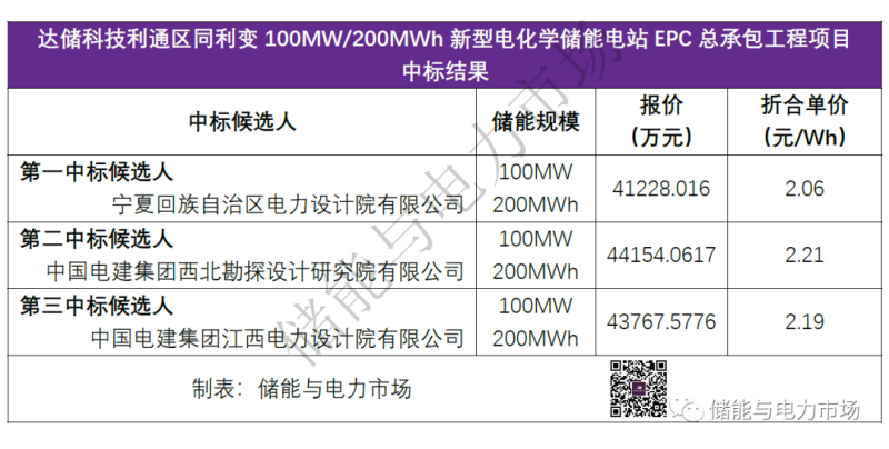 中國儲(chǔ)能網(wǎng)訊:近日達(dá)儲(chǔ)科技利通區(qū)同利變100MW/200MWh新型電化學(xué)儲(chǔ)能電站EPC總承包工程項(xiàng)目發(fā)布中標(biāo)結(jié)果,寧夏回族自治區(qū)電力設(shè)計(jì)院有限公司以總報(bào)價(jià)41228萬元,折合單價(jià)2.06元/Wh,成為第一中標(biāo)候選人。