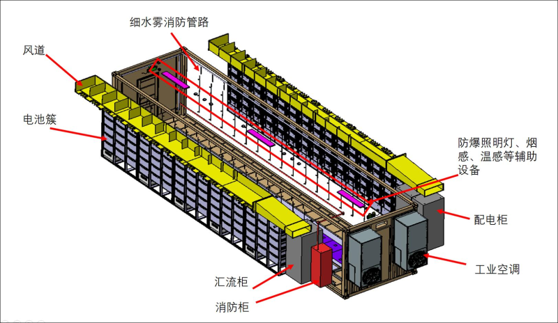 1)系統(tǒng)設(shè)計。江北儲能電站電池預(yù)制艙設(shè)計時融合了電氣設(shè)計、結(jié)構(gòu)設(shè)計、電池選型、熱管理設(shè)計、消防設(shè)計及保護策略等諸多方面,從各個層面對電池艙的安全行進行把控,保證電池預(yù)制艙安全可靠合規(guī)的運行。