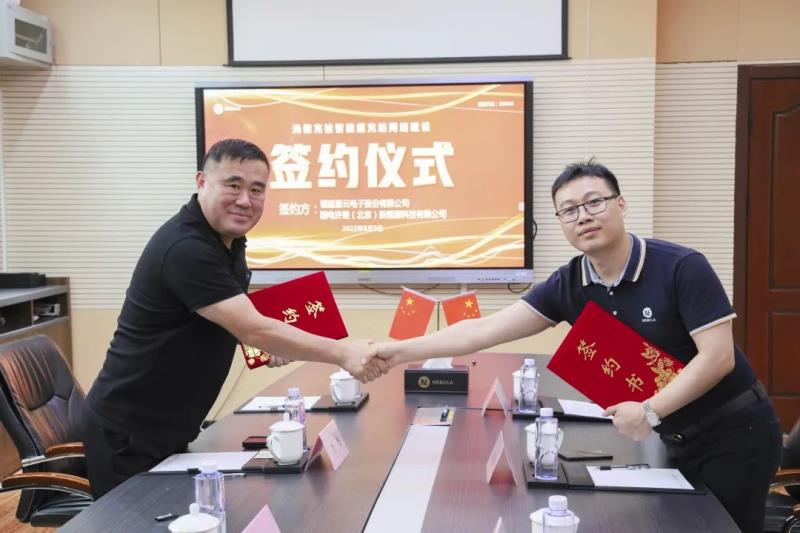 星云股份董事兼總裁劉作斌(右)與國電許繼(北京)新能源科技有限公司總經(jīng)理?xiàng)罟獯黼p方進(jìn)行合作簽約