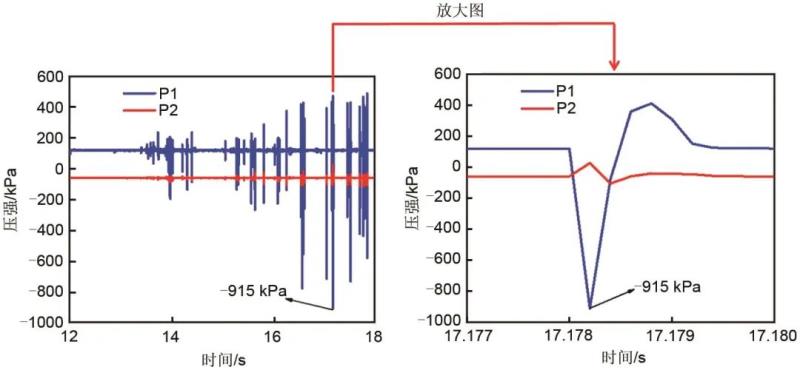 單體電池試樣過充實驗過程中測得的壓力波曲線見圖6,實驗中測到的距離爆心45 cm處最大壓強達到556 kPa。根據(jù)實驗觀測分析,電池爆炸裂口方向正對P1傳感器壓力面,因而此處測到的壓力波最大,表明電池單體爆炸事故的破壞力與電池開口方向密切相關(guān)。壓力波數(shù)據(jù)分析可知,容量為13.5 Ah的鋰離子電池爆炸可導(dǎo)致周邊人員發(fā)生一定程度的損傷[18]。