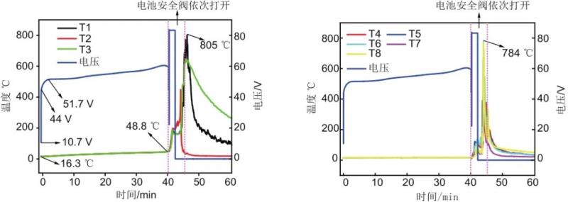 電壓方面,第一階段,由于該電池組試樣前期做了過放電的試驗,電池組狀態(tài)不同于正常的電池組。此時,電池組內(nèi)的電池由于過放造成了內(nèi)部電化學(xué)體系的破壞,導(dǎo)致電池歐姆內(nèi)阻提高,使得電池組的歐姆電阻(1.23 Ω)大于常規(guī)電池組的歐姆電阻(毫歐級別),所以,在恒流充電的瞬間,電池組電壓明顯上升,從10.7 V到了44 V。在40 min之前,電池組首先從過放電狀態(tài)轉(zhuǎn)變?yōu)闈M電態(tài),此時電池組電壓表現(xiàn)平穩(wěn),幅度相對較小,然后從滿電態(tài)轉(zhuǎn)變?yōu)檫^充電狀態(tài),此時電壓明顯上升,幅度逐漸變大。第二階段在實驗進行40 min以后,電池組電壓開始劇烈波動,最低電壓接近20 V,這表明電池內(nèi)部結(jié)構(gòu)已經(jīng)發(fā)生顯著變化,電池發(fā)生部分內(nèi)短路,釋放大量熱量,電池內(nèi)部壓力迅速提高,導(dǎo)致泄壓閥打開。而后電池完全內(nèi)短路,電壓為0 V,溫度進一步升高,電池?zé)崾Э亍?