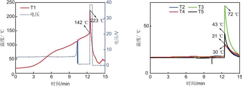 單體電池試樣過充實驗溫度、電壓變化曲線如圖5所示。