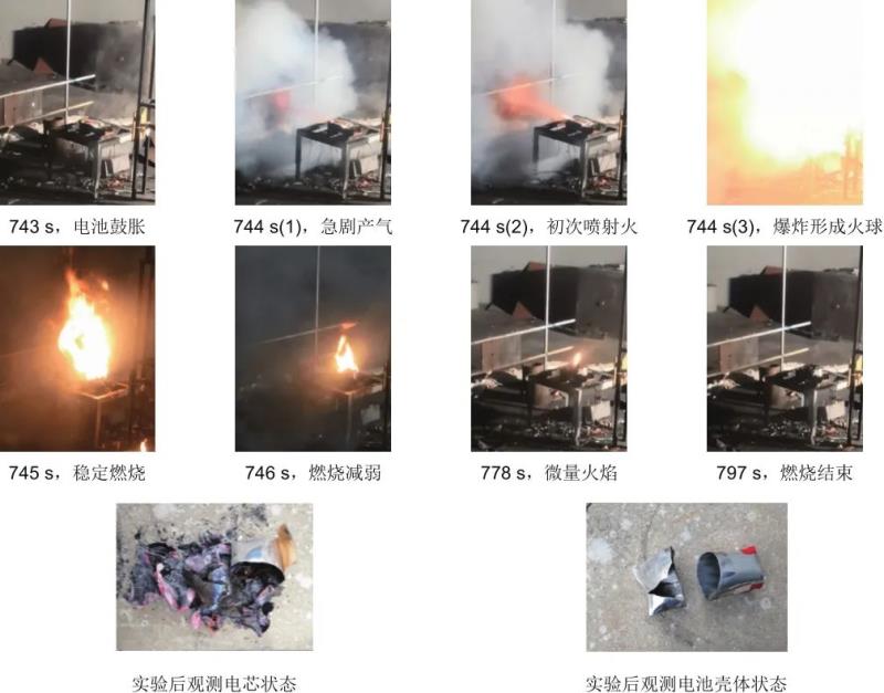 鋰離子單體電池過充實驗現(xiàn)象見圖4。實驗過程可大致分為3個階段:第一階段為電池殼體鼓脹變形階段,從實驗開始至743 s時可見電池殼體變形,電池試樣周邊散逸少量白色煙氣。這一階段,過充僅導(dǎo)致電池內(nèi)部材料發(fā)生各類反應(yīng)并產(chǎn)生一定的氣體,電池殼體內(nèi)部壓力增大導(dǎo)致電池出現(xiàn)外觀鼓脹變形。少量白色煙氣的產(chǎn)生主要是因為隨著電池過充釋放出一定的熱量,導(dǎo)致電池外殼及不燃隔熱材料等產(chǎn)生熱分解。第二階段射流火及爆炸階段,持續(xù)時間僅為1 s。實驗進行至744 s時安全閥打開,在1 s時間內(nèi)電池釋放大量白色煙氣、急劇噴射火焰并瞬時發(fā)生爆炸,形成巨大火球。由于實驗最高電壓上限設(shè)置為10倍額定電壓(37 V),在較高的截止電壓過充下,電解質(zhì)、電極以及集流體的電阻顯著增大,電池動力學(xué)性能及熱穩(wěn)定性顯著降低,內(nèi)部化學(xué)反應(yīng)增強。隨著持續(xù)過充電池內(nèi)部反應(yīng)的加劇,產(chǎn)氣量不斷增大導(dǎo)致電池內(nèi)部壓力也急劇增大,僅安全閥破裂泄壓難以實現(xiàn)電池內(nèi)部和外部的平衡,因而發(fā)生電池殼體撕裂出現(xiàn)爆炸。電池內(nèi)部熱失控反應(yīng)產(chǎn)生的可燃氣體和電解液與空氣混合后被引燃,形成初次射流火并伴隨著爆炸形成了強烈的火球。第三階段為穩(wěn)定燃燒階段,爆炸后能量得到泄放,支架上電池內(nèi)部殘余的電解液及可燃材料仍持續(xù)猛烈燃燒,火焰持續(xù)53 s后完全熄滅。實驗后觀測圖片可見,電芯中銅箔和鋁箔表面的所有物質(zhì)均已過火,電池爆裂位置并未發(fā)生在安全閥附近,而是在位于電池殼體約1/3處完全撕裂,進一步表明爆炸瞬間安全閥的破裂不足以實現(xiàn)電池殼體內(nèi)外壓力平衡,在744 s時電池內(nèi)部產(chǎn)氣壓力大大超過了安全閥設(shè)定的閾值。
