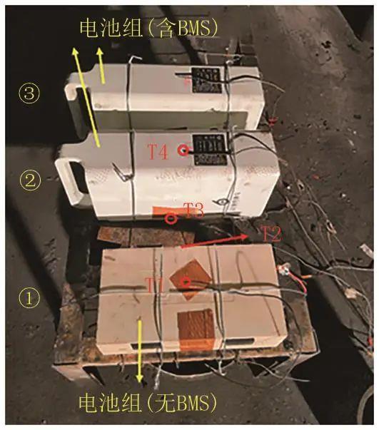 為了考察多個鋰離子電池組在一定間距下相互引燃的情況,采用3個鋰離子電池組在間距6.5 cm的條件下開展實驗,布置如圖3所示。實驗時將3個電池組放置于鐵支架上,其中1號不帶BMS的電池組水平放置,安全閥方向朝向2號電池組,2號、3號電池組側(cè)立放置,安全閥方向朝上。采用4支熱電偶測量電池表面溫度及煙氣、火焰溫度。實驗仍在爆炸洞內(nèi)完成,在室溫條件下,以27 A(2 C)電流對1號鋰離子電池組進行恒流過充,最高電壓上限設(shè)置為80 V。