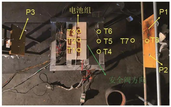 實驗現(xiàn)場條件與鋰離子單體電池實驗條件相同,實驗布置如圖2所示。實驗時采用8支熱電偶(T1~T8)測量電池組表面殼體溫度以及火焰溫度。T1、T2、T3位于電池表面上,其中T2位于電池殼體中心處,向兩側(cè)偏移15 cm分別為T1和T3,T1靠近接線端。T4、T5、T6、T7、T8與電池的最短距離分別為10 cm、10 cm、10 cm、20 cm、45 cm。設(shè)置3個壓力傳感器(P1~P3)監(jiān)測電池組熱失控后的壓力波。P1、P2、P3與電池的最短距離分別為45 cm、45 cm、30 cm。