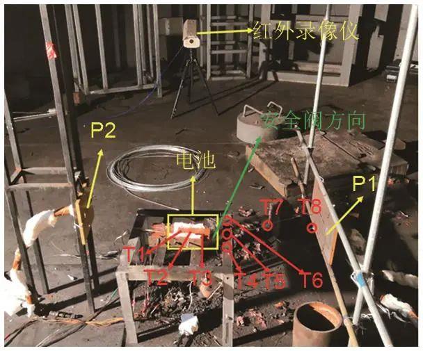 實驗現(xiàn)場選擇在爆炸洞內(nèi),將樣品電池采用水平放置的方式,放置在距地面50 cm的支架上,如圖1所示。電池兩側(cè)采用夾具固定,并采用一定厚度的隔熱棉隔離電池和支架以減少熱量損失。在爆炸洞外,用計算機程序遠程控制IT6522A型充放電儀(南京艾德克斯公司)測試系統(tǒng)對樣品電池做過充測試,記錄其電流電壓隨時間的變化情況。在爆炸洞外觀察孔處布置一架APX RX型高速攝影儀(日本Photron公司),記錄樣品電池的爆炸過程。采用5支直徑為2 cm、量程范圍為0~1200 ℃的K型鎧裝熱電偶(T1~T5)測量電池表面、煙氣及火焰溫度,其中T1位于電池表面中心位置;T2、T3、T4與電池上表面的距離均為5 cm;T5距離電池上表面15 cm。在距離電池安全閥約45 cm處布置2個211B6型壓力傳感器(瑞士KISTLER公司,P1~P2),測定樣品電池?zé)崾Э睾螽a(chǎn)生的壓力波。