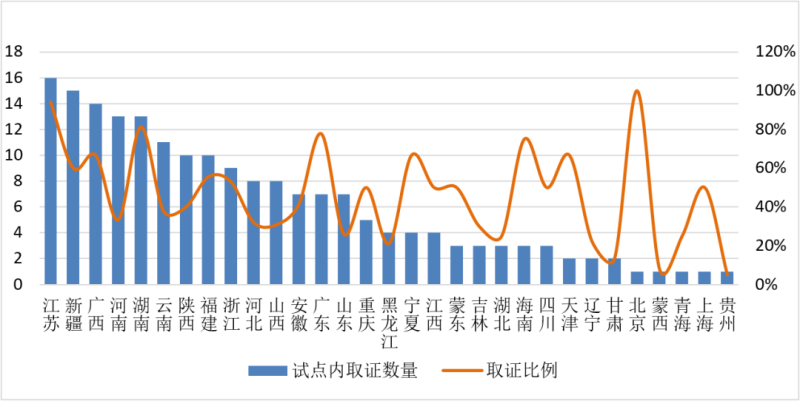 圖2 各?。▍^(qū)、市)增量配電業(yè)務試點取證數(shù)量及取證比例