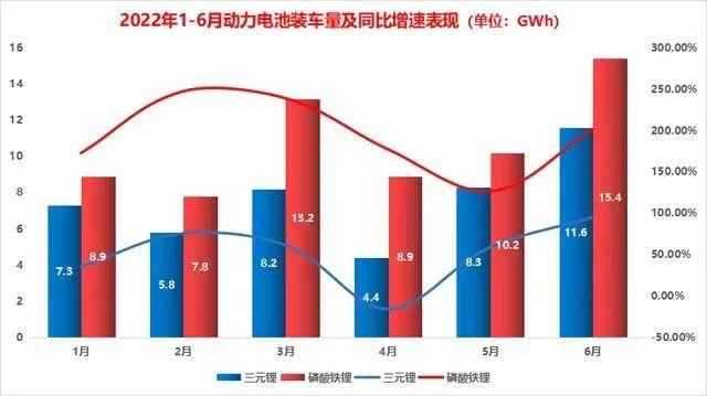 根據(jù)創(chuàng)新聯(lián)盟公布的數(shù)據(jù),磷酸鐵鋰電池與三元鋰電池之間的份額差距持續(xù)擴大。上半年,磷酸鐵鋰電池累計裝車量64.4GWh,增長189.7%,占總裝車量58.5%;三元電池累計裝車量45.6GWh,同比增長51.2%,占比為41.4%。