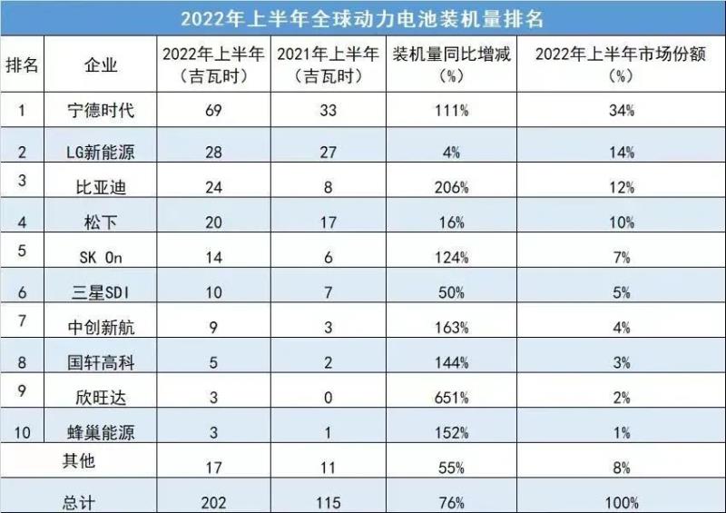 近年來,在全球動力電池裝機排行榜前十名中,只能看到中、韓、日三個國家的身影。數(shù)據(jù)顯示,2022年上半年,全球電動汽車電池市場規(guī)模達到202吉瓦時,同比增長76%。