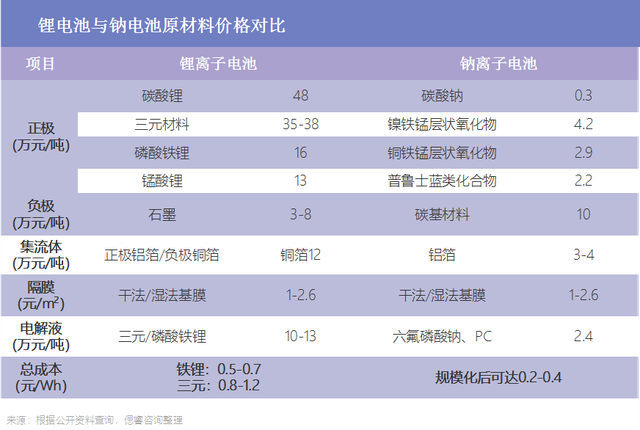 綜合正負(fù)極、集流體、隔膜、電解液等原材料,鋰電池(鐵鋰方案)的綜合成本介于0.5-0.7元/Wh,而鈉離子電池的綜合成本則有望達(dá)到0.2-0.4元/Wh。