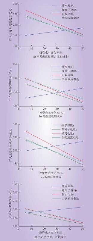 由圖8可知,不計(jì)及建設(shè)期、征地成本時(shí),投資成本變化率低于35%時(shí),抽水蓄能的LCC、LCOE最低;投資成本變化率高于40%時(shí),鋰離子電池的LCC、LCOE最低。計(jì)及建設(shè)期時(shí),投資成本變化率低于25%時(shí),抽水蓄能的LCC、LCOE最低;投資成本變化率高于30%時(shí),鋰離子電池的LCC、LCOE最低。計(jì)及征地成本時(shí),投資成本變化率低于20%時(shí),抽水蓄能的LCC、LCOE最低;投資成本變化率高于20%時(shí),鋰離子電池的LCC、LCOE最低。計(jì)及建設(shè)期、征地成本時(shí),投資成本變化率達(dá)到10%時(shí),鋰離子電池的LCC、LCOE最低。