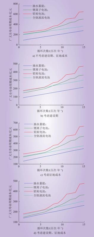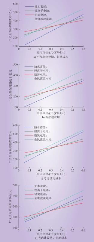 由圖7可知,在充電電價(jià)較低時(shí),抽水蓄能的成本優(yōu)勢(shì)明顯;反之,鉛炭電池的成本優(yōu)勢(shì)明顯,以圖7 b)為例,充電電價(jià)小于0.5元/(kW·h)時(shí),抽水蓄能成本最低;反之,鉛炭電池成本最低。建設(shè)期、征地成本等因素對(duì)不同儲(chǔ)能的成本競(jìng)爭(zhēng)力具有一定的影響,對(duì)比圖7 b)和圖7 d),抽水蓄能與鉛炭電池成本競(jìng)爭(zhēng)力的邊界降為0.3元/(kW·h)。鋰離子電池的全壽命周期成本總體處于抽水蓄能與鉛炭電池之間,而全釩液流電池的全壽命周期成本最高,僅在充電電價(jià)較低時(shí)具有部分競(jìng)爭(zhēng)優(yōu)勢(shì)。