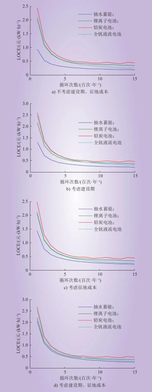 抽水蓄能的LCOE最低,鉛炭電池的LCOE最高;計(jì)及建設(shè)期時(shí),充放電循環(huán)次數(shù)低于800次/年時(shí),鋰離子電池的LCOE低于全釩液流電池。