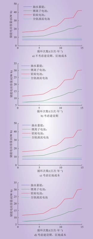 綜上可以看出,抽水蓄能具備成本優(yōu)勢(shì),鋰離子電池儲(chǔ)能電站在項(xiàng)目建設(shè)期上優(yōu)勢(shì)顯著,鉛炭電池的壽命成為制約其市場(chǎng)化應(yīng)用的重要原因。結(jié)合4種儲(chǔ)能的技術(shù)特性,有必要分析充放電循環(huán)次數(shù)、儲(chǔ)能電站充電電價(jià)、投資成本的變化對(duì)結(jié)果的影響。
