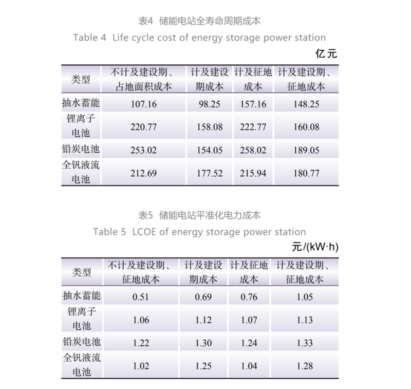 基于等效能折算,不計(jì)及建設(shè)期時(shí),各類型儲(chǔ)能電站的規(guī)模分別為鋰離子電池儲(chǔ)能1789 MW/10733 MW·h、鉛炭電池儲(chǔ)能2763 MW/16581 MW·h、全釩液流電池儲(chǔ)能1440 MW/8641 MW·h;計(jì)及建設(shè)期時(shí),各類型儲(chǔ)能電站的規(guī)模分別為鋰離子電池儲(chǔ)能1243 MW/7457 MW·h、鉛炭電池儲(chǔ)能1979 MW/11871 MW·h、全釩液流電池儲(chǔ)能1197 MW/7185 MW·h。儲(chǔ)能電站全壽命周期成本、平準(zhǔn)化電力成本計(jì)算結(jié)果如表4、表5所示。