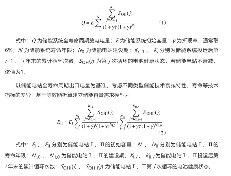 為客觀評(píng)價(jià)分析不同類型儲(chǔ)能的成本競(jìng)爭(zhēng)力,需統(tǒng)一儲(chǔ)能電站全壽命周期放電電量,結(jié)合儲(chǔ)能系統(tǒng)壽命,以典型儲(chǔ)能容量為基準(zhǔn),通過(guò)等效能折算,結(jié)合容量衰減特性分析其他類型儲(chǔ)能容量。儲(chǔ)能容量定義為投運(yùn)時(shí)儲(chǔ)能電站可放電電量,電站級(jí)儲(chǔ)能應(yīng)用壽命評(píng)估的邊界條件通常設(shè)置健康狀態(tài)值低于80%[14]。儲(chǔ)能電站全壽命周期放電電量為