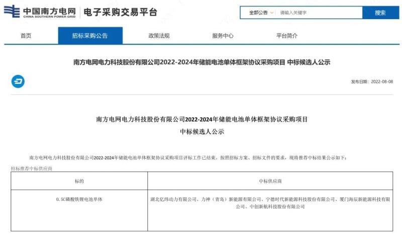 中國(guó)儲(chǔ)能網(wǎng)訊:8月8日,南方電網(wǎng)電力科技股份有限公司發(fā)布2022-2024年儲(chǔ)能電池單體框架協(xié)議采購(gòu)項(xiàng)目中標(biāo)候選人公示,廈門海辰新能源科技有限公司(簡(jiǎn)稱“海辰儲(chǔ)能”)等五家企業(yè)成功入圍中標(biāo)候選人名單。