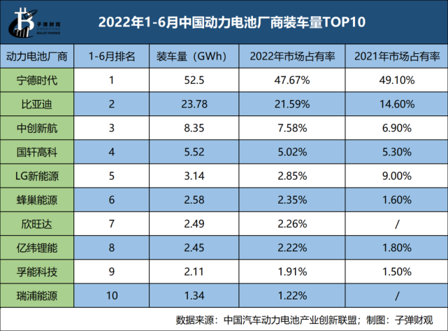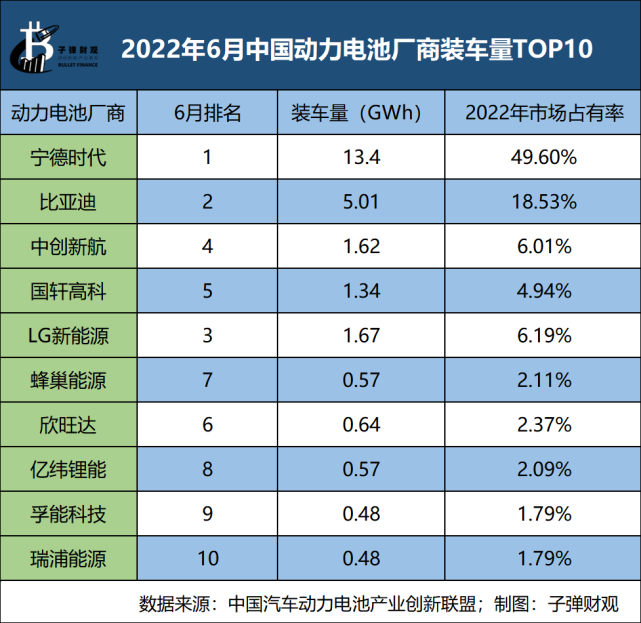 7月11日,中國汽車動力電池產(chǎn)業(yè)創(chuàng)新聯(lián)盟公布了6月動力電池裝車量數(shù)據(jù):中國動力電池裝車量為27.0GWh,同比增長143.3%,其中寧德時代以13.40GWh的裝車量位列第一名,其市場占有率為49.60%,而比亞迪、LG新能源、中創(chuàng)新航和國軒高科位列第二至五名。
