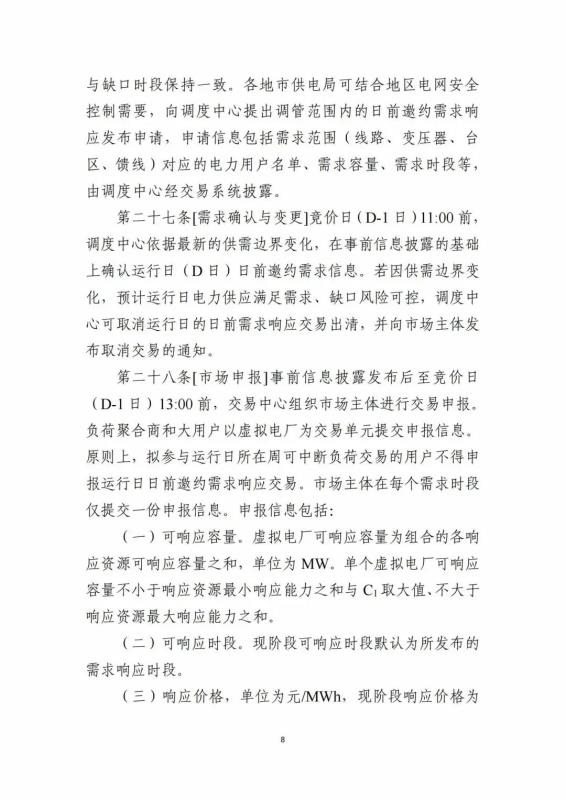 現階段可響應時段默認為所發(fā)布的需求響應時段。響應價格現階段響應價格為9單段報價,具備條件后可啟用多段報價。日前邀約申報價格上限為3500元/MWh;日前邀約虛擬電廠申報可響應容量下限0.3MW,可中斷負荷申報價格上限為5000元/MWh;可中斷負荷虛擬電廠申報可響應容量下限為0.3MW。