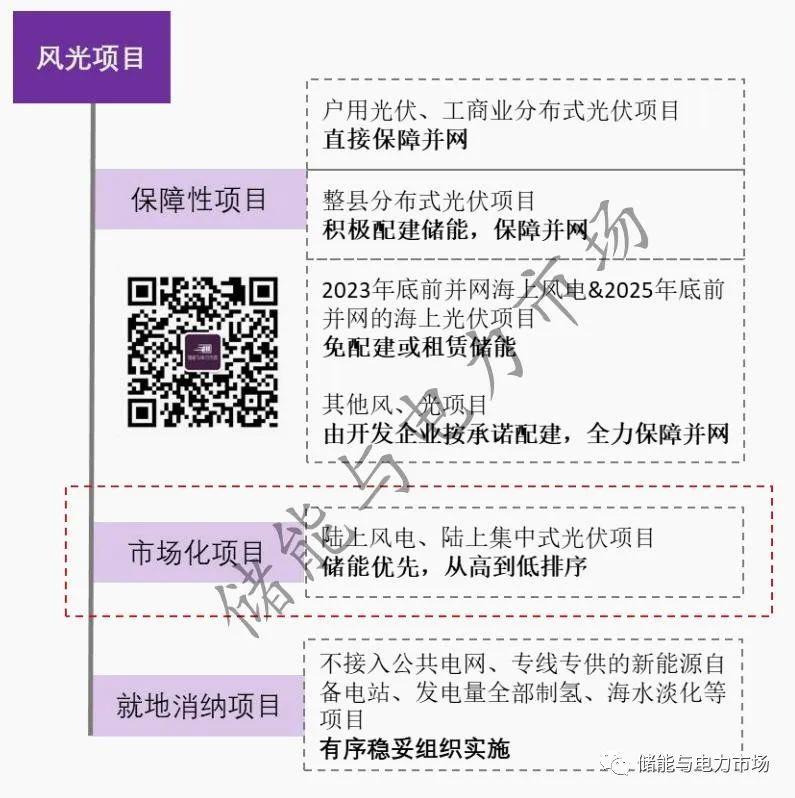 《實(shí)施辦法》將風(fēng)光項(xiàng)目分為保障性項(xiàng)目、市場(chǎng)化項(xiàng)目、就地消納項(xiàng)目三大類(lèi),其中市場(chǎng)化項(xiàng)目將嚴(yán)格按照儲(chǔ)能優(yōu)先的原則,由高至低排序。