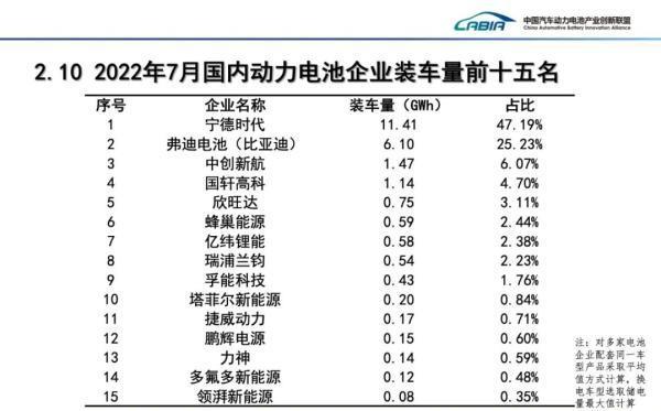 同時,中國汽車動力電池產(chǎn)業(yè)創(chuàng)新聯(lián)盟還公布了7月國內(nèi)動力電池裝車量前15名的企業(yè)。其中,寧德時代以47.19%的占比穩(wěn)居第一,弗迪電池(比亞迪)、中創(chuàng)新航、國軒高科、欣旺達分別以25.23%、6.07%、4.70%、3.11%的占比位居2-5位。此外,6至15位依次是蜂巢能源、億緯鋰能、瑞浦蘭鈞、孚能科技、塔菲爾新能源、捷威動力、鵬輝電源、力神、多氟多新能源、領湃新能源。