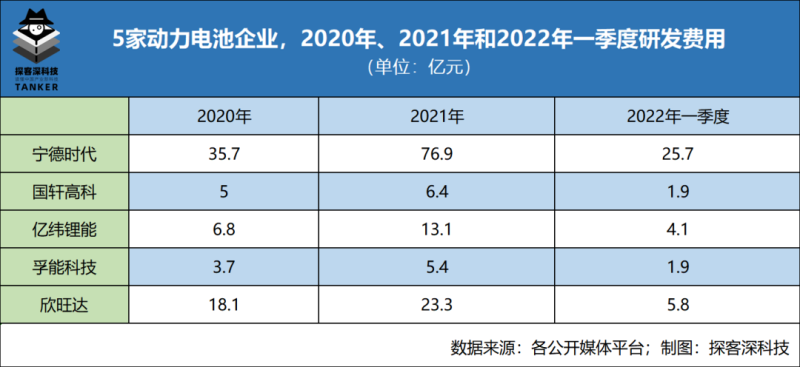記者梳理財(cái)報(bào)發(fā)現(xiàn),寧德時(shí)代、國(guó)軒高科、億緯鋰能、孚能科技和欣旺達(dá)這5家動(dòng)力電池企業(yè),在2020年、2021年和2022年一季度的研發(fā)費(fèi)用分別如下圖所示。