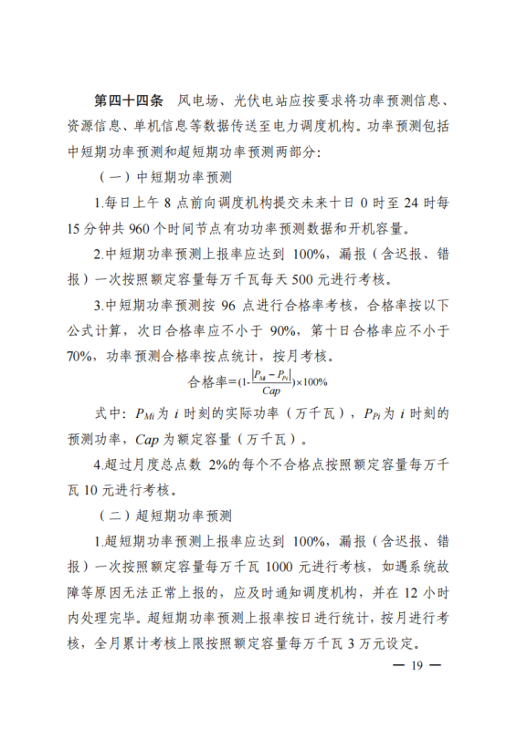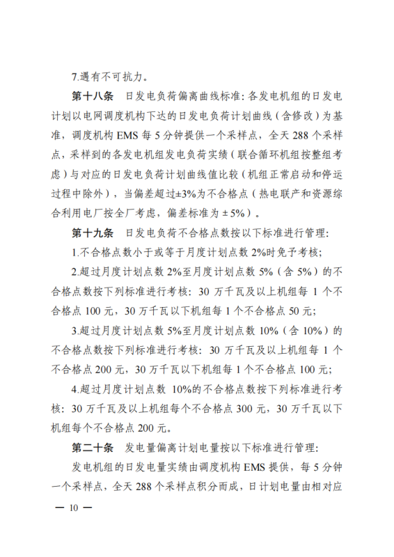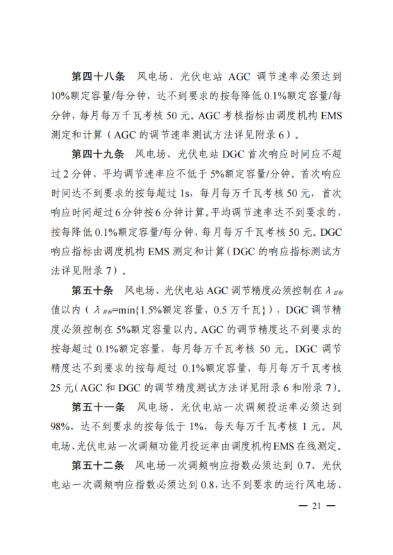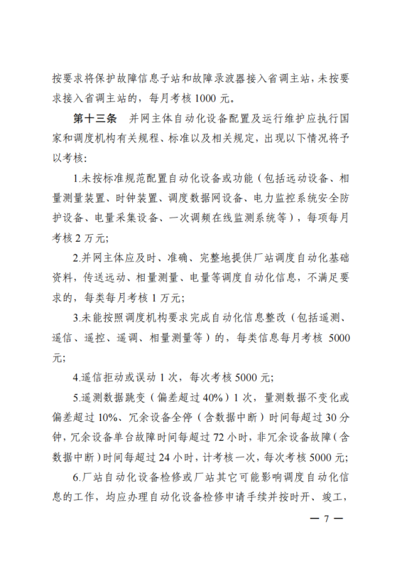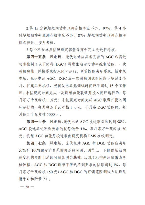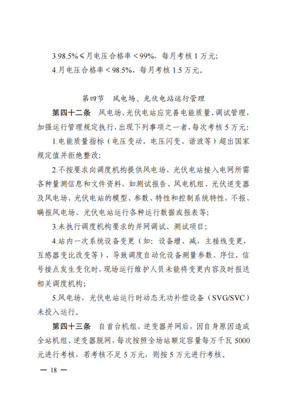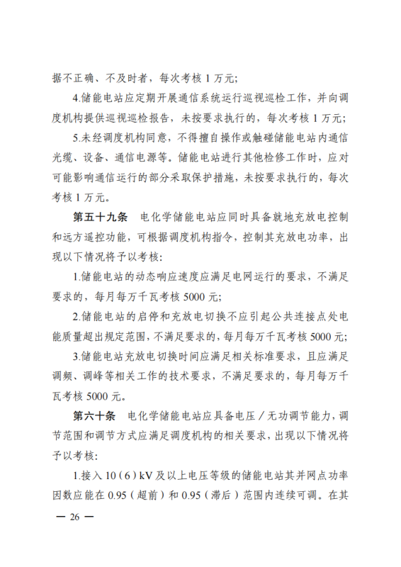 電化學(xué)儲能電站應(yīng)同時(shí)具備就地充放電控制和遠(yuǎn)方遙控功能,可根據(jù)調(diào)度機(jī)構(gòu)指令,控制其充放電功率,出現(xiàn)以下情況將予以考核:儲能電站的動態(tài)響應(yīng)速度應(yīng)滿足電網(wǎng)運(yùn)行的要求,不滿足要求的,每月每萬千瓦考核 5000 元;儲能電站的啟停和充放電切換不應(yīng)引起公共連接點(diǎn)處電能質(zhì)量超出規(guī)定范圍,不滿足要求的,每月每萬千瓦考核 5000 元;儲能電站充放電切換時(shí)間應(yīng)滿足相關(guān)標(biāo)準(zhǔn)要求,且應(yīng)滿足調(diào)頻、調(diào)峰等相關(guān)工作的技術(shù)要求,不滿足要求的,每月每萬千瓦考核5000 元。