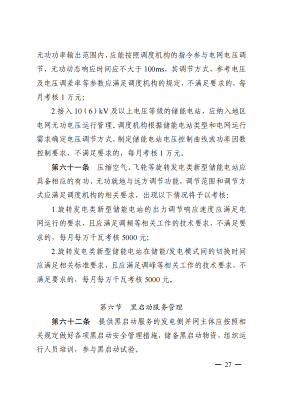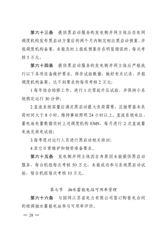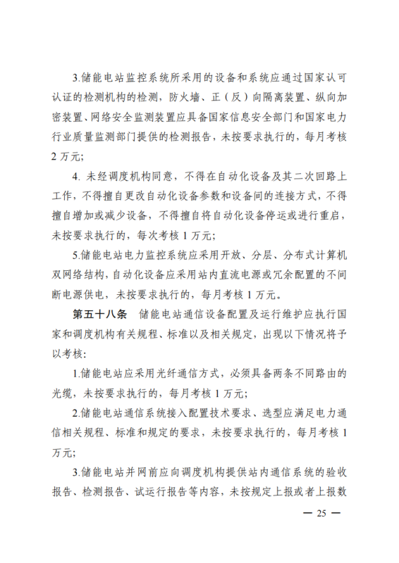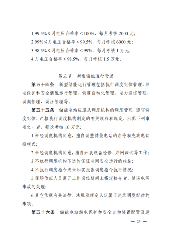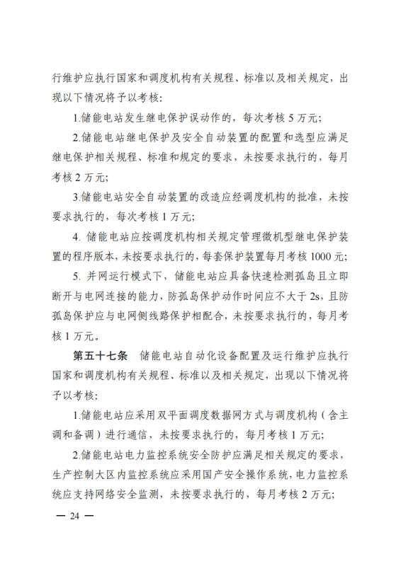 其中,《江蘇電力并網(wǎng)運(yùn)行管理實(shí)施細(xì)則》單獨(dú)設(shè)置“新型儲能運(yùn)行管理”、“抽水蓄能電站可用率管理”章節(jié),明確要求儲能電站應(yīng)服從調(diào)度機(jī)構(gòu)的調(diào)度管理,出現(xiàn)各類違規(guī)情況將需要支付考核費(fèi)用:如出現(xiàn)擅自調(diào)整儲能電站的啟停和充放電切換模式、擅自開展設(shè)備檢修并網(wǎng)調(diào)試工作、或值班人員離守延誤電網(wǎng)事故處理等情況,每次考核10萬元;如儲能電站發(fā)生繼電保護(hù)誤動作的,每次考核5萬元;儲能電站繼電保護(hù)及安全自動裝置的配置和選型未按要求執(zhí)行的,每月考核2萬元。