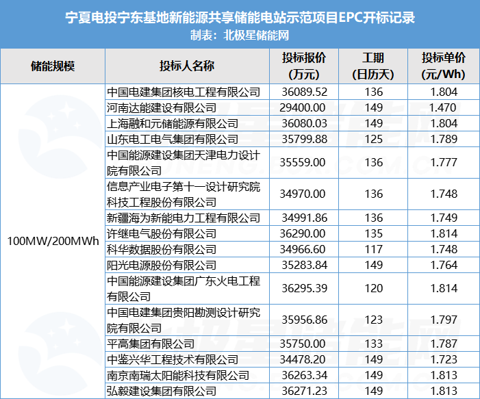 中國(guó)儲(chǔ)能網(wǎng)訊:8月16日,寧夏電投寧東新能源有限公司發(fā)布寧夏電投寧東基地新能源共享儲(chǔ)能電站示范項(xiàng)目一期100MW/200MWh工程EPC總承包中標(biāo)候選人公示。開(kāi)標(biāo)記錄顯示,本次共有16家企業(yè)參與其中,最低投標(biāo)單價(jià)為1.47元/Wh。