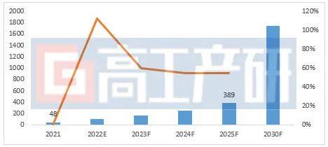 2021-2030年中國儲(chǔ)能鋰電池出貨量及預(yù)測(單位:GWh,%)