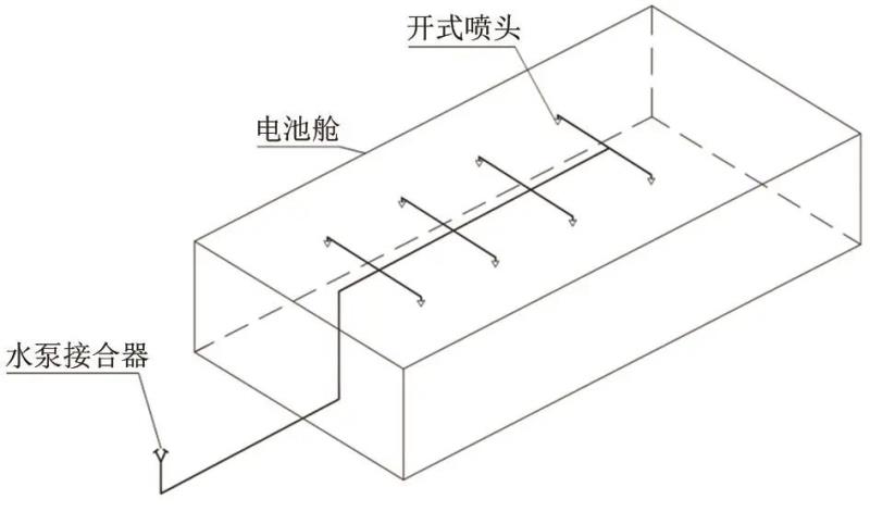 工程設(shè)計(jì)中考慮儲(chǔ)能電池預(yù)制艙內(nèi)同一時(shí)間起火單元為1只單體電池,但儲(chǔ)能電池艙電池堆積密集,鋰電池?zé)崾Э剌^為復(fù)雜,如果全氟己酮滅火系統(tǒng)未能及時(shí)撲滅初期火災(zāi)而大范圍著火(多只單體電池,甚至多個(gè)電池模組、電池簇著火),將致使全氟己酮滅火劑量不足,從而使得儲(chǔ)能電池艙火災(zāi)不可控。鑒于此,本工程在每個(gè)儲(chǔ)能電池艙設(shè)置半固定開(kāi)式水噴淋系統(tǒng)(圖10):該半固定開(kāi)式水噴淋系統(tǒng)由開(kāi)式噴頭、水泵接合器、管道等組成,在儲(chǔ)能電池艙內(nèi)頂部設(shè)置開(kāi)式噴頭,并在艙外設(shè)置水泵接合器,設(shè)計(jì)用水量為1個(gè)水泵接合器的流量,即15 L/s。平時(shí)該半固定開(kāi)式水噴淋系統(tǒng)為空管狀態(tài),不存在管道凍脹、系統(tǒng)誤噴等風(fēng)險(xiǎn)。一旦全氟己酮滅火系統(tǒng)失效時(shí),外部消防用水則可通過(guò)半固定開(kāi)式水噴淋系統(tǒng)注入艙內(nèi)浸漬滅火,實(shí)現(xiàn)滅火控火,防止火災(zāi)事故進(jìn)一步擴(kuò)大。需要說(shuō)明的是,采用該應(yīng)急措施后,整個(gè)儲(chǔ)能電池預(yù)制艙將基本報(bào)廢。
