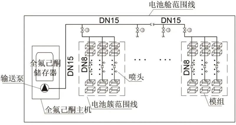 基于模型試驗(yàn)結(jié)論,結(jié)合本工程儲(chǔ)能電池艙布置及實(shí)際凈空間,每座儲(chǔ)能電池預(yù)制艙設(shè)置1套全氟己酮?dú)怏w滅火系統(tǒng)(圖9),該系統(tǒng)由全氟己酮主機(jī)(包括存儲(chǔ)裝置、輸送裝置、控制系統(tǒng)等)、分區(qū)控制閥、管網(wǎng)和霧化噴頭等組成。全氟己酮滅火劑采用泵組輸送,主管為DN15的鍍鋅鋼管,支管采用DN8軟管,每個(gè)電池簇設(shè)置1只分區(qū)控制閥(電動(dòng)球閥)及3根支管,每根支管設(shè)置4只噴頭,每個(gè)電池簇共計(jì)12只噴頭。經(jīng)過(guò)溫度、海拔修正后,滅火劑量設(shè)計(jì)取值90 L,其對(duì)應(yīng)滅火濃度與模型試驗(yàn)相應(yīng)濃度相當(dāng)。
