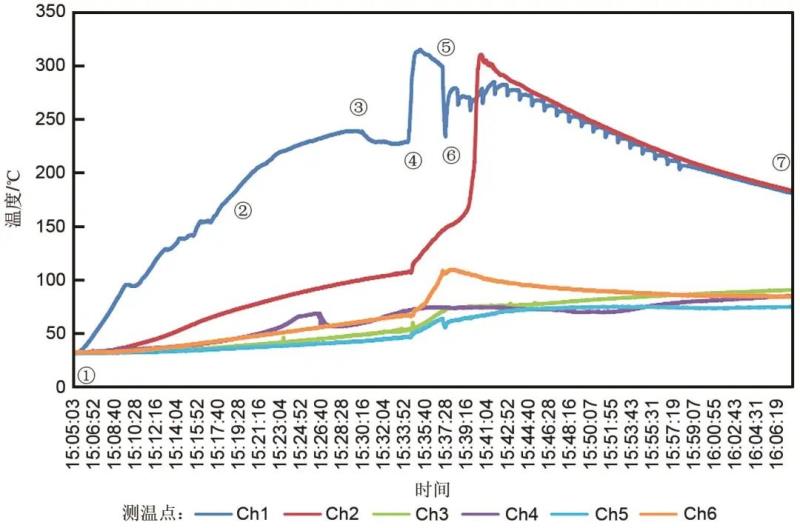 圖5 電池模組(箱)火災(zāi)試驗(yàn)溫度曲線