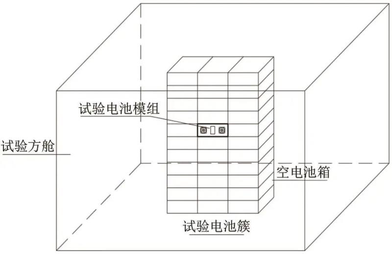 基于火災(zāi)發(fā)生的邏輯分析,火災(zāi)模型設(shè)計(jì)儲(chǔ)能電池預(yù)制艙內(nèi)初期同一時(shí)間起火單元為1只單體電池,模型選定某塊單體電池為試驗(yàn)電池致其熱失控著火,一定反應(yīng)時(shí)間后注入全氟己酮滅火劑滅火。待滅火后,觀察試驗(yàn)電池引起的連鎖反應(yīng)范圍,同時(shí)記錄相關(guān)的全氟己酮滅火系統(tǒng)參數(shù)。