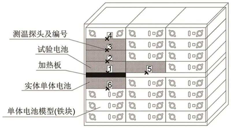 試驗(yàn)所用電池簇模型均采用全尺寸模型,包括:?jiǎn)误w鋰電池選用容量為150 Ah的方形磷酸鐵鋰電池(產(chǎn)品實(shí)體),外形尺寸為174 mm×170 mm×48 mm;試驗(yàn)用電池模組(電池箱)模型尺寸為655 mm×510 mm×190 mm,內(nèi)部布置如圖3所示,其中實(shí)體電池5塊,其余位置為等尺寸模型替代;電池簇模型尺寸為1781 mm×658 mm×2369 mm。電池簇中,除試驗(yàn)電池模組外,實(shí)際工況擺放的其他電池模組均為空箱,見(jiàn)圖4。將電池簇模型放置于儲(chǔ)能電池試驗(yàn)方艙內(nèi),儲(chǔ)能電池試驗(yàn)方艙尺寸為3500 mm×2450 mm×3200 mm,見(jiàn)圖3~4。選定某塊單體電池為試驗(yàn)電池,在其下部安裝加熱設(shè)備,并在試驗(yàn)電池周圍布置多個(gè)測(cè)溫裝置,監(jiān)測(cè)相鄰位置處電池的溫度和電池箱內(nèi)溫度,見(jiàn)圖3。全氟己酮滅火劑通過(guò)6只霧化噴頭注入,霧化噴頭布置在電池簇后側(cè)。