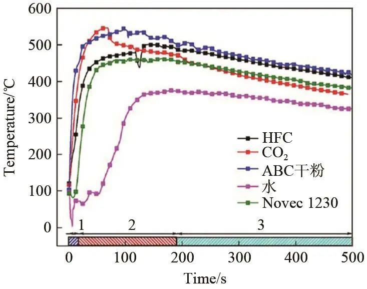 圖2 各類滅火劑對(duì)三元鋰離子電池火災(zāi)的抑制能力