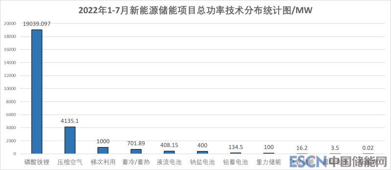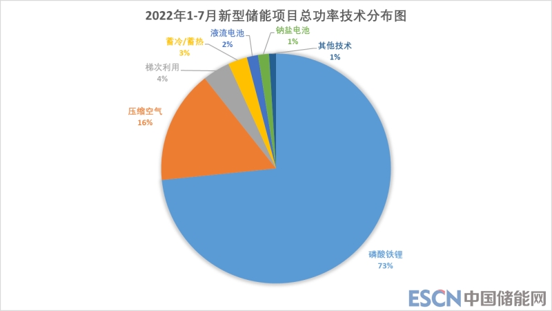 新型儲能項(xiàng)目依舊以電化學(xué)儲能項(xiàng)目為主,占比近80%,其中電化學(xué)儲能項(xiàng)目儲能技術(shù)絕大多數(shù)我磷酸鐵鋰儲能,占比達(dá)90%以上,是現(xiàn)在電化學(xué)儲能項(xiàng)目所采用的主要技術(shù)。此外,壓縮空氣項(xiàng)目的潛能逐漸體現(xiàn),2022年1-7月規(guī)劃中、建設(shè)中的壓縮空氣項(xiàng)目裝機(jī)功率總量占比16%,共4.2GW,我國發(fā)展壓縮空氣儲能還具有巨大潛力。
