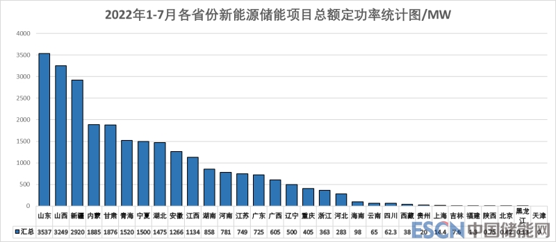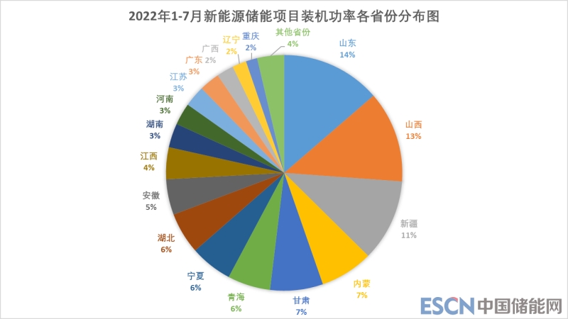 由各省份新能源項(xiàng)目額定功率分布圖可以看出,2022年1-7月新能源儲能項(xiàng)目額定裝機(jī)功率Top10省份為山東、山西、新疆、內(nèi)蒙、甘肅、青海、寧夏、湖北、安徽、江西,其中山東、山西和新疆三個省份裝機(jī)功率遙遙領(lǐng)先,總占比近38%。