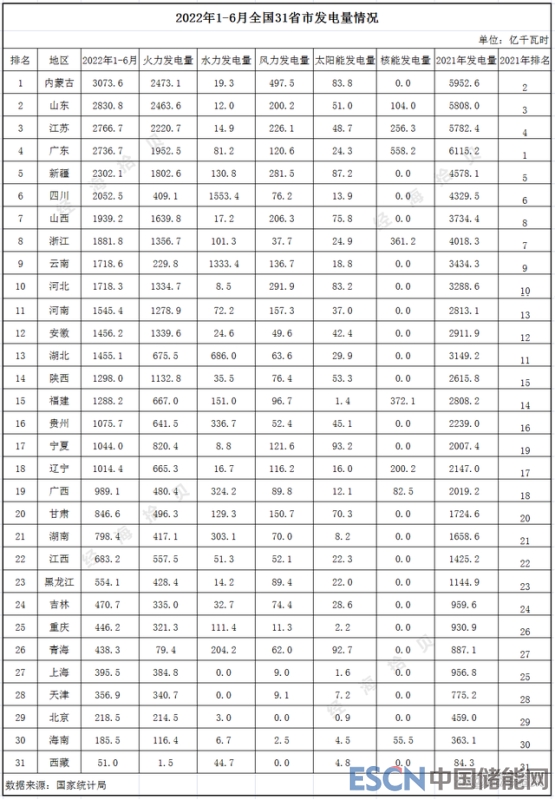 根據(jù)國(guó)家統(tǒng)計(jì)局的數(shù)據(jù)顯示,在2021年,我國(guó)的發(fā)電總量達(dá)到81121.8億千瓦時(shí),累計(jì)增長(zhǎng)8.1%。2022年1-6月,全國(guó)發(fā)電量為39631億千瓦時(shí),累計(jì)增長(zhǎng)0.7%。上半年發(fā)電量排在前十名的省份依次是:內(nèi)蒙古、山東、江蘇、廣東、新疆、四川、山西、浙江、云南、河北,發(fā)電量均超過(guò)1500億千瓦時(shí)。上半年發(fā)電量前十的省份,在2021年同樣位居前十名。