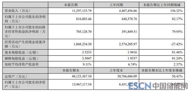 中國(guó)儲(chǔ)能網(wǎng)訊:8月23日,寧德時(shí)代晚間披露半年度報(bào)告,公司2022年半年度實(shí)現(xiàn)營(yíng)業(yè)收入為1129.71億元,同比增長(zhǎng)156.32%;歸母凈利潤(rùn)81.68億元,同比增長(zhǎng)82.17%;基本每股收益3.52元。擬向全體股東每10股派發(fā)現(xiàn)金紅利6.5280元(含稅)。