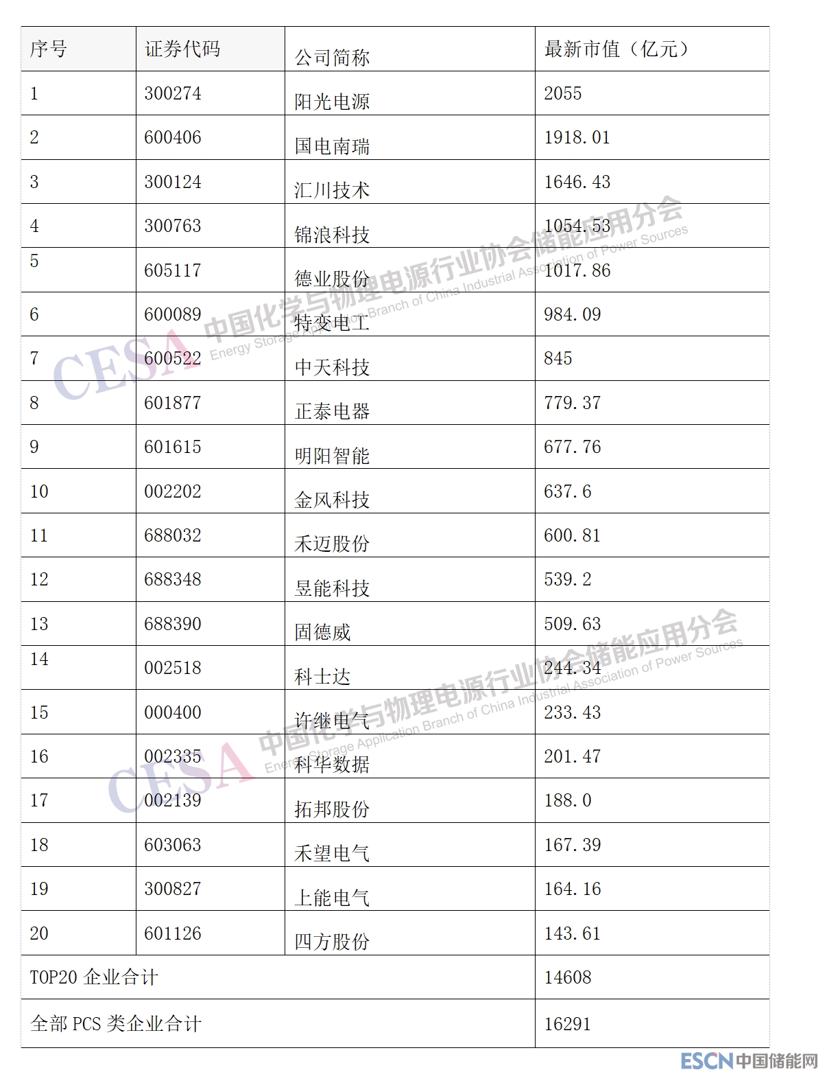 從中國(guó)化學(xué)與物理電源行業(yè)協(xié)會(huì)儲(chǔ)能應(yīng)用分會(huì)政策研究中心觀察的260余家儲(chǔ)能上市公司名單看,涉及儲(chǔ)能PCS生產(chǎn)的企業(yè)有49之多,其他非上市公司亦不在少數(shù),如南瑞繼保、冠隆電力、英博電氣、古瑞瓦特、索英電氣等出貨量大且創(chuàng)新能力強(qiáng)的企業(yè),國(guó)內(nèi)PCS廠家合計(jì)已達(dá)80余家,相應(yīng)外資品牌有20余家,整個(gè)市場(chǎng)上PCS廠家已超過100家。據(jù)CESA儲(chǔ)能應(yīng)用分會(huì)產(chǎn)業(yè)政策研究中心對(duì)儲(chǔ)能PCS上市公司統(tǒng)計(jì),2022年儲(chǔ)能PCS類上市公司總市值已達(dá)1.63萬億元,其中TOP20企業(yè)總市值如下表所列。