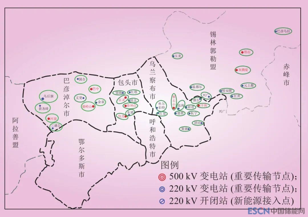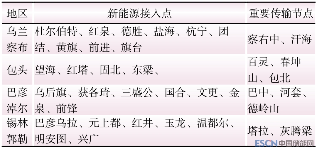對儲能的配置位置進行合理規(guī)劃是降低儲能系統(tǒng)投資、提高運行效益以及提升整個系統(tǒng)運行穩(wěn)定性和資源利用效率的重要手段。文獻[24]提出了針對新能源側儲能選址優(yōu)化的通用性結論:在電力系統(tǒng)中的重要傳輸節(jié)點和可再生能源的發(fā)電接入點配置儲能可以在兼顧經(jīng)濟性和系統(tǒng)穩(wěn)定性的因素下達到儲能選址配置的最優(yōu)。因此,本文采用上述結論進行蒙西地區(qū)儲能選址分析。以《內(nèi)蒙古電網(wǎng)2021年度運行方式》提供的相關資料為參考依據(jù),蒙西地區(qū)的風電、光伏資源主要集中在烏蘭察布、包頭、巴彥淖爾以及錫林浩特地區(qū),分別占蒙西地區(qū)新能源裝機容量的23.32%、21.63%、17.86%和15.62%。這些地區(qū)的重要傳輸結點以察右中、百靈、巴中、塔拉等500 kV變電站為主。在兼顧系統(tǒng)穩(wěn)定性及經(jīng)濟性因素下,重點在上述4個地區(qū)的新能源接入點和重要傳輸節(jié)點進行儲能配置,具體選址如表1所示。其中,新能源接入點主要為220 kV變電站,重要傳輸節(jié)點為500 kV變電站,部分重要傳輸節(jié)點亦是新能源接入點,不再重復列出。